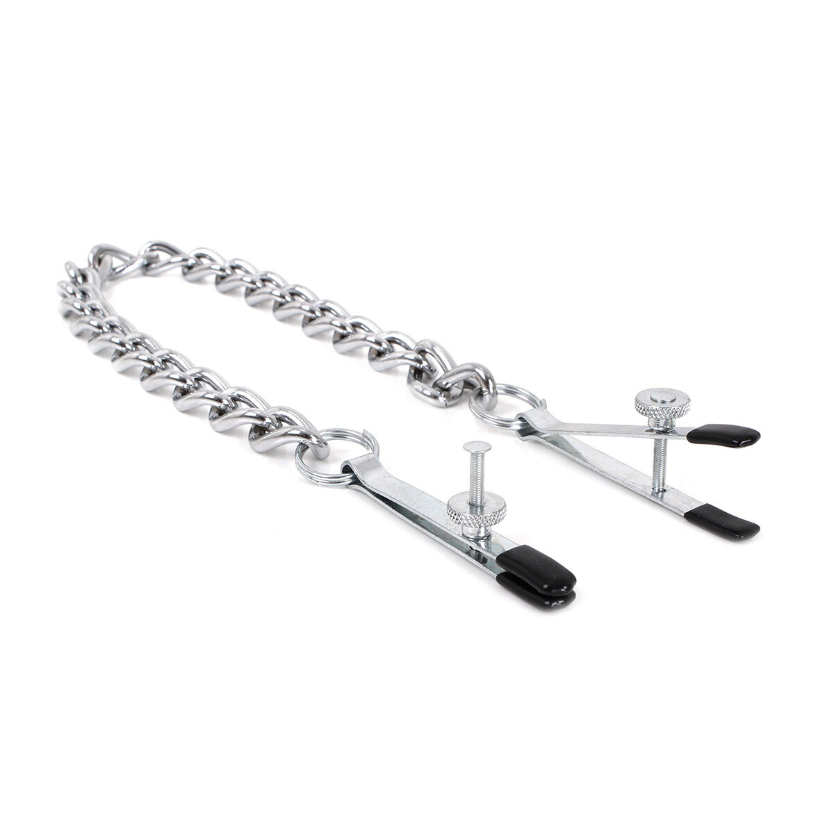 The tension of the clamps can be easily adjusted using the screw mechanism at the ends, allowing you to customize the intensity to your liking. Connected by a long, sturdy chain, these nipple clamps not only add a captivating aesthetic but also enhance the experience with a satisfying weight, making them a striking and functional addition to your collection.